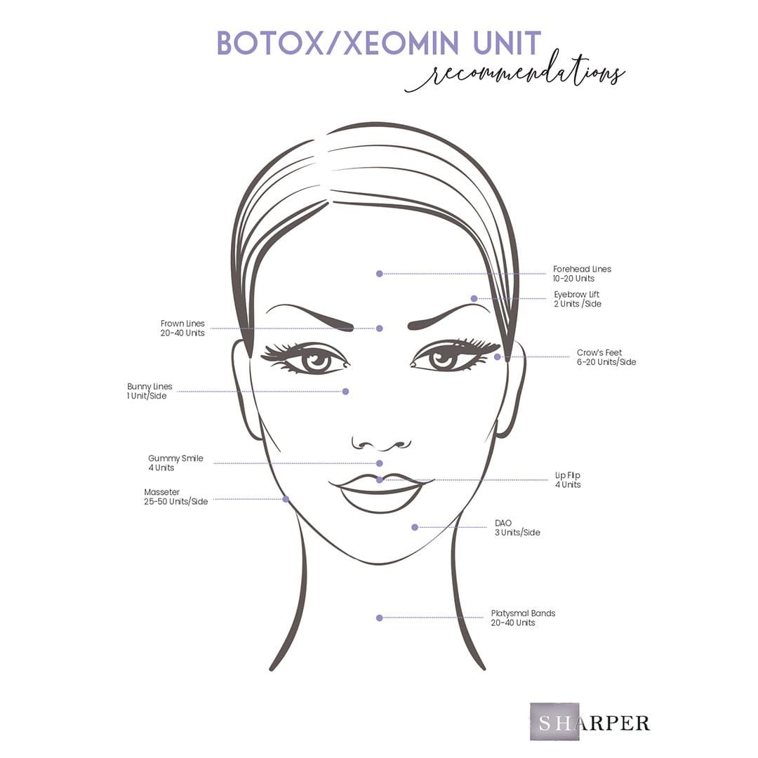 Well, that’s a bit of a puzzle because everyone’s muscles are unique. During a consultation, I’ll ask you to make various facial expressions (yes, we’re talking about frowns and smiles) to determine the right dosage for you. Our aim is to ensure you get the best and longest-lasting results. I’ve also attached a general guide for how many units we use in each area. I want to emphasize that dose equals duration – following your injector’s recommendations is key to achieving results that last for at least 10 weeks.